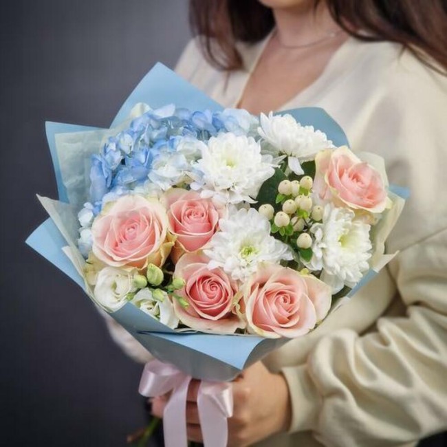 The Blue Lagoon Bouquet is a captivating and elegant arrangement featuring 1 delicate eustoma, 1 lush hydrangea, 1 piece of wrapping paper, 1 vibrant hypericum, 1 beautiful bush chrysanthemum, and 5 exquisite Ecuador Frutteto roses. This sophisticated bouquet radiates serenity and charm, making it perfect for expressing love, admiration, or adding a touch of elegance to any special occasion.