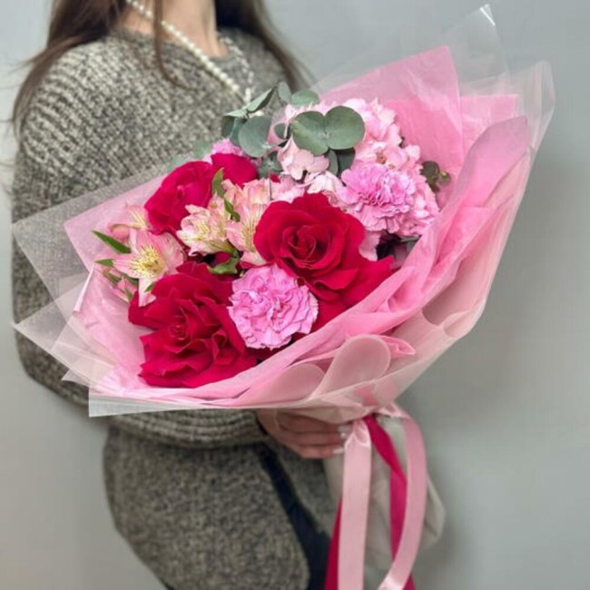 The Bouquet with French Roses and Hydrangea is an exquisite arrangement featuring 1 lush eucalyptus stem, 1 elegant hydrangea, 3 charming pink carnations, 2 delicate pink alstroemerias, and 3 beautiful Sophia Lauren roses, all wrapped in stylish packaging. This sophisticated design radiates grace and beauty, making it perfect for expressing love, admiration, or adding a touch of elegance to any special occasion.